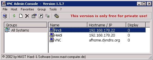 Sind auch noch andere Rechner fernzusteuern oder zu überwachen, dann ist es sinnvoll diese Computer von einer geeigneten Konsole aus aufzurufen und dort alle wichtige Angaben (IP, Rechnername, Passwort, ... ) zu speichern. Dafür bietet sich das Tool VNC Admin Console an.